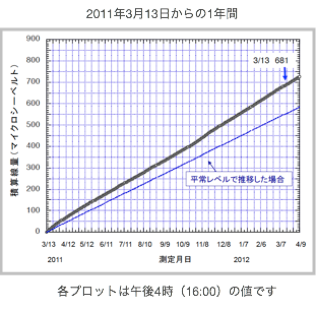 田内の実測の外部被ばく積算線量は、この1年間で682マイクロシーベルト(0.68ミリシーベルト:4月15日の失われた推定1マイクロシーベルトを加えています)でした。