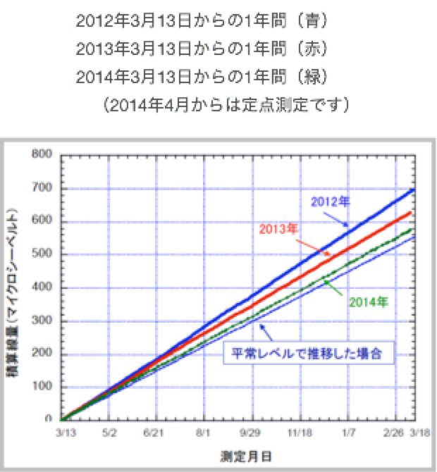 3年目(2013)も計測しました。2014年3月13日16:00までの1年間の積算は627マイクロシーベルトで、平年の14.5%増となり、2年目と比べてさらに低下しました。